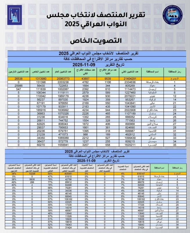 أعلنت المفوضية العليا المستقلة للانتخابات، اليوم الأحد (9 تشرين الثاني 2025)، عن تقرير المنتصف لانتخابات مجلس النواب للتصويت الخاص.