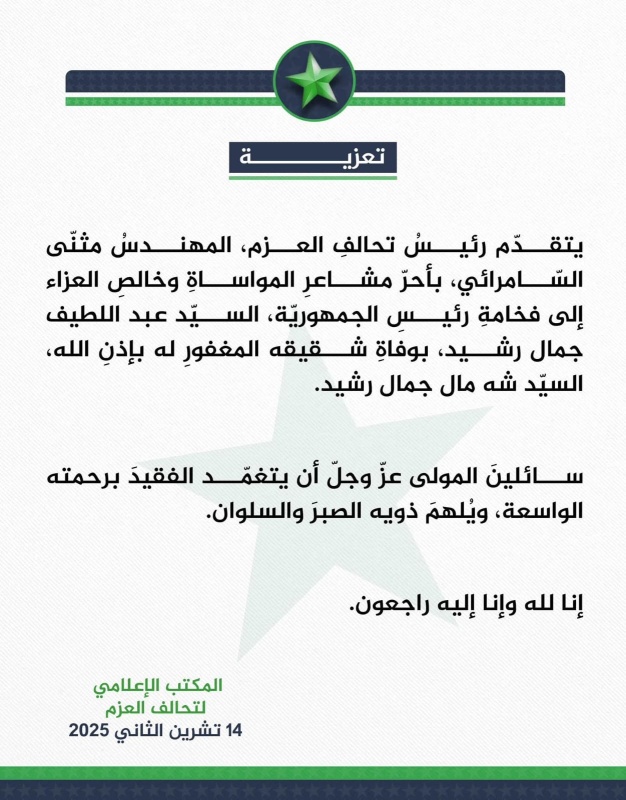 قدم رئيس تحالف العزم مثنى السامرائي، اليوم الجمعة (14 تشرين الثاني 2025)، تعازيه إلى رئيس الجمهورية عبد اللطيف جمال رشيد، بوفاة شقيقه شمال جمال رشيد.