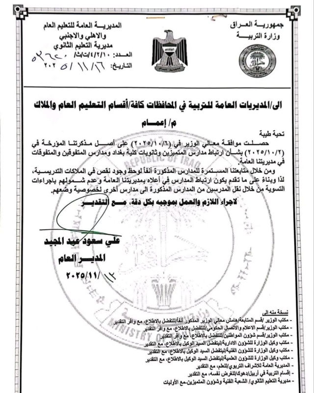 وافق وزير التربية إبراهيم نامس الجبوري، على أن تكون مدارس المتميزين وثانويات كلية بغداد ومدارس المتفوقين والمتفوقات مرتبطة بالمديرية العامة للتعليم العام والأهلي والأجنبي، مع عدم شمول ملاكاتها التدريسية بإجراءات التسوية.