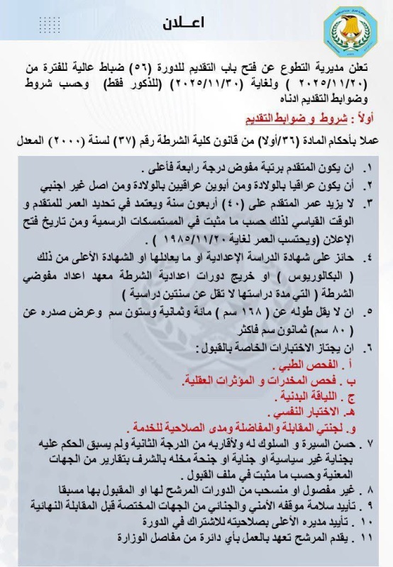 أعلنت وزارة الداخلية، اليوم الخميس (20 تشرين الثاني 2025)، ضوابط وشروط القبول في الدورة (56) الخاصة بضباط كلية الشرطة، مؤكدة أن التقديم سيتم وفق معايير محددة تشمل المؤهلات العلمية والفحوصات البدنية والطبية وآليات المفاضلة المعتمدة لدى الوزارة.