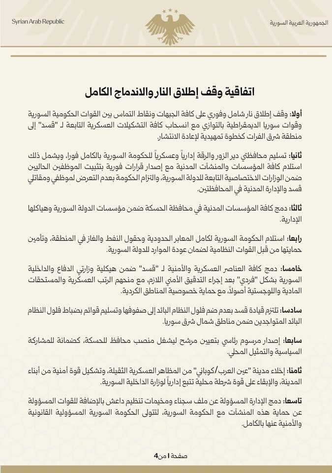 وينص الاتفاق على “وقف شامل وفوري لإطلاق النار على جميع الجبهات ونقاط التماس بين القوات الحكومية السورية وقوات سوريا الديمقراطية، بالتوازي مع انسحاب جميع التشكيلات العسكرية التابعة لـ”قسد” إلى منطقة شرق الفرات، كخطوة تمهيدية لإعادة الانتشار”.