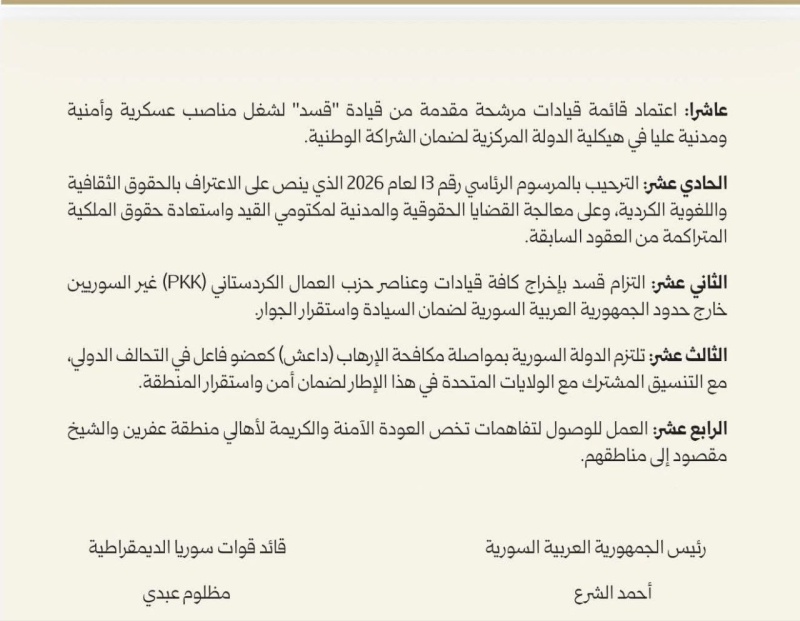 وقّع الرئيس السوري أحمد الشرع، اليوم الأحد ( 18 كانون الثاني 2026 )، اتفاقاً لوقف إطلاق النار مع قوات سوريا الديمقراطية “قسد”، يتضمن اندماجها الكامل في صفوف الجيش السوري، في خطوة وُصفت بالمفصلية على طريق بسط سلطة الدولة على كامل الأراضي السورية.